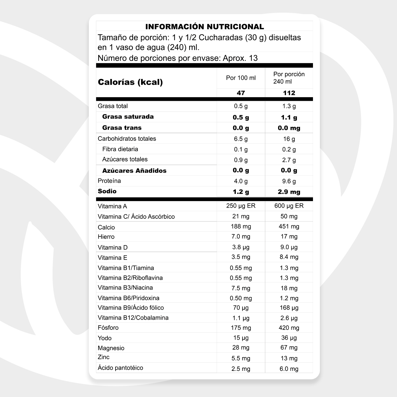 Libre de azúcares añadidos y grasas trans, su fórmula avanzada es ideal para incluir en tu rutina diaria como parte de una alimentación balanceada. Se disuelve fácilmente en agua, jugos o batidos, brindando un sabor suave y una textura ligera que puedes disfrutar en cualquier momento del día.